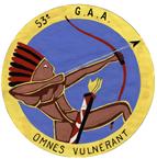 53e Groupe d’artillerie de l’air (l’insigne de gauche est le projet initial, approuvé en avril 1943 par le commandant de l’aviation française d’Afrique, figurant sur le fanion du groupe, mais non fabriqué ; celui de droite est celui approuvé le 26 février 1946 alors que le groupe est stationné à Cazaux, et fabriqué) |