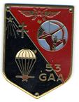 53e Groupe d’artillerie de l’air (l’insigne de gauche est le projet initial, approuvé en avril 1943 par le commandant de l’aviation française d’Afrique, figurant sur le fanion du groupe, mais non fabriqué ; celui de droite est celui approuvé le 26 février 1946 alors que le groupe est stationné à Cazaux, et fabriqué) |